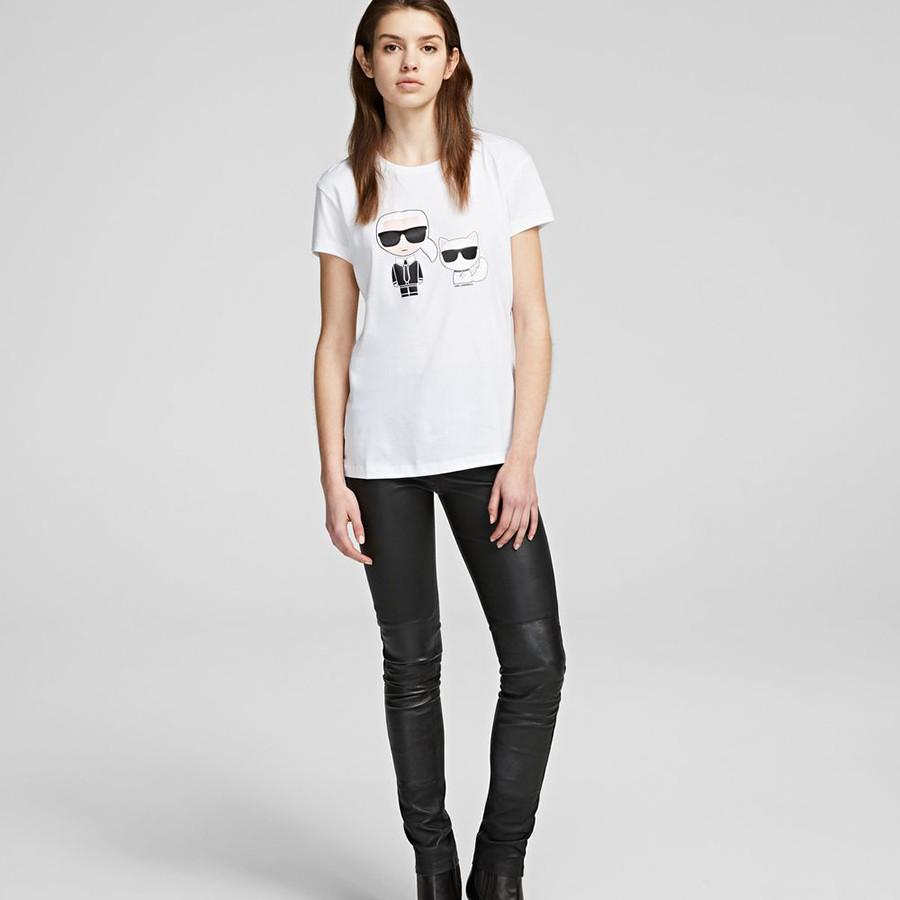 Áo Thun Karl & Choupette Ikonik Tee Màu Trắng được cắt từ chất liệu cotton sang trọng, chiếc áo phông giản dị này được phủ một tác phẩm nghệ thuật của Karl Lagerfeld và Choupette đeo kính râm đặc trưng của họ.